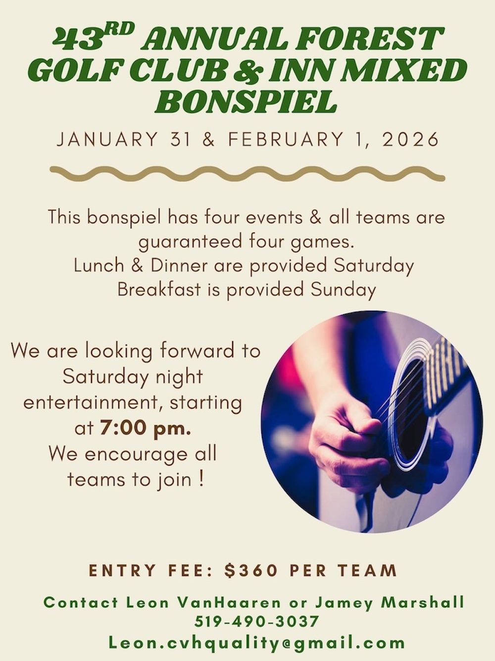 CLUB OPEN - Forest Curling Club to host Two Stick Provincials February 20-22, 2026. Thanks to everyone who participated in the recent youth Youngies and Oldies bonspiel as well as the TD L'il Rockers Olympics! Both events were a huge success. Be sure to visit the galleries for all the latest photos of these as well as many other events in the club.