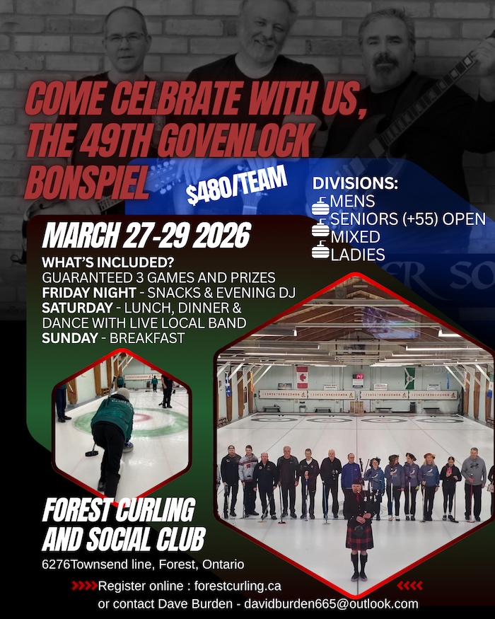 CLUB OPEN - Forest Curling Club to host Two Stick Provincials February 20-22, 2026. Playoff season is quickly approaching. Continue to monitor your league pages for the latest scheduled weekly updates! Be sure to visit the galleries for all the latest photos of these as well as many other events in the club.